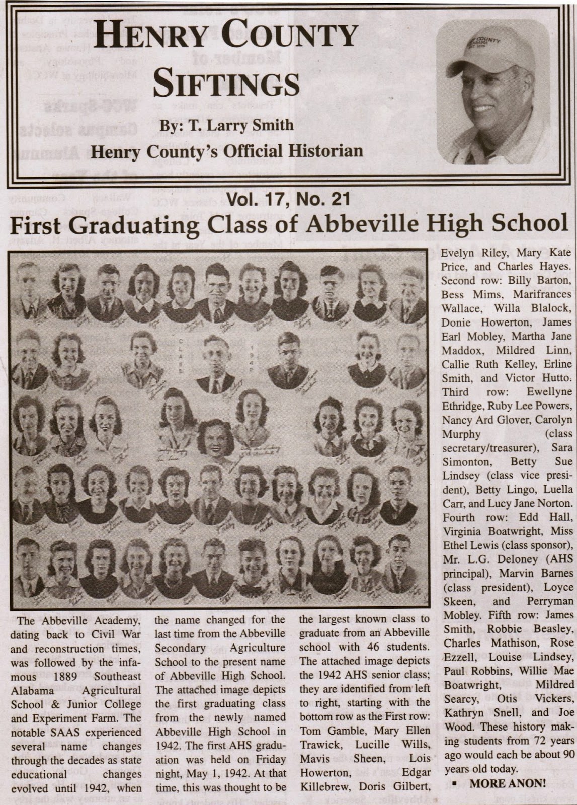 Am so sorry for being "months" late, but I promised to respond to this photo of the newly named Abbeville High School in 1942. Of course, as I told you earlier, Charles Hayes, my brother-in-law, was a member of this class.