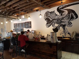 I rarely go out for coffee anymore unless I am meeting somebody for a chat. The city, though, has plenty of fine coffee shops, including this one in West Asheville, where I stopped by yesterday. The T-Rex mural is quite impressive! Check out Spoon University's The 8 Best Coffee Shops in Downtown Asheville for a flavor of what else is brewing.